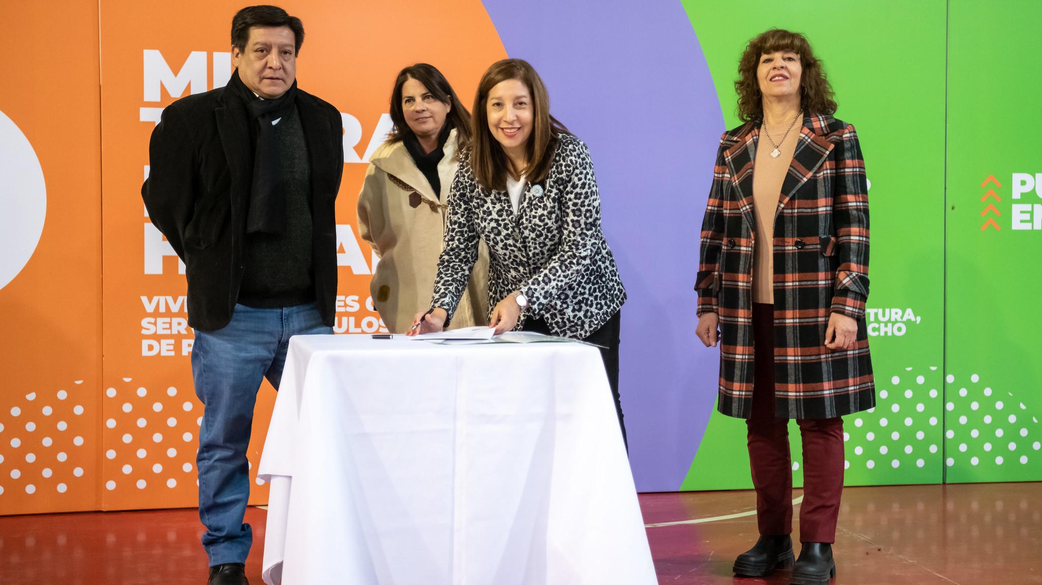 La Gobernadora Arabela Carreras y representantes sindicales firmaron los convenios para dotar de servicios a 441 lotes de Cinco Saltos, a través del Programa provincial “Mi Tierra, Mi Hogar”. Además, entregó lotes a 152 vecinos, vecinas e instituciones de la zona de El Arroyón.
