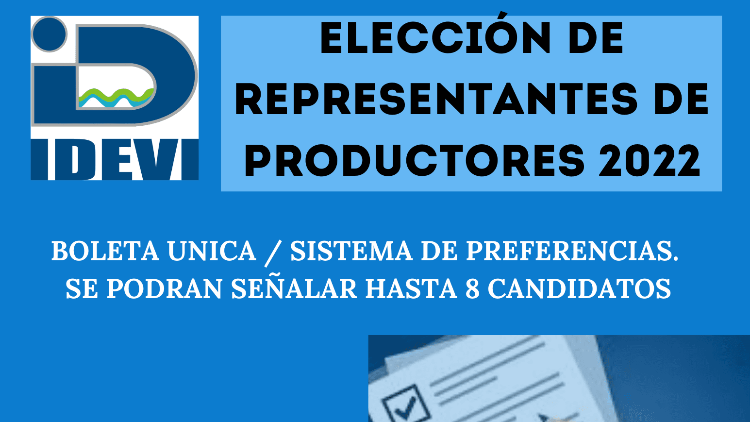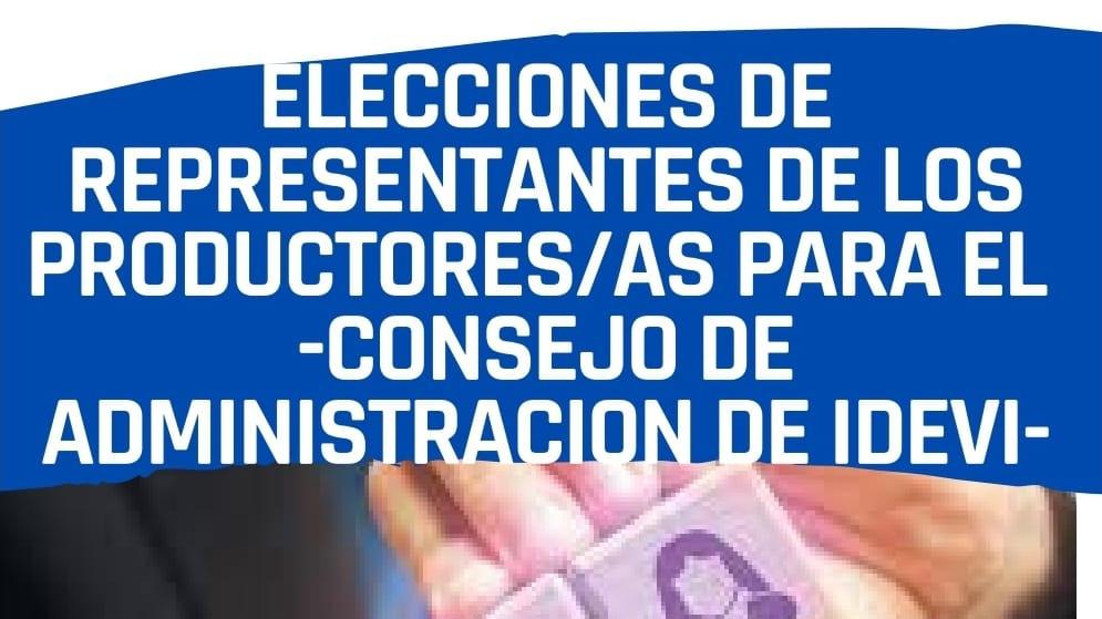 El Instituto de Desarrollo del Valle Inferior informa que el próximo 20 de mayo se realizarán las elecciones para representantes de productores para ser parte del Consejo de Administración de IDEVI.